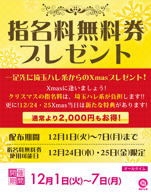 クリスマスの指名料は、埼玉ハレ系が負担します!通常よりも2,000円もお得!