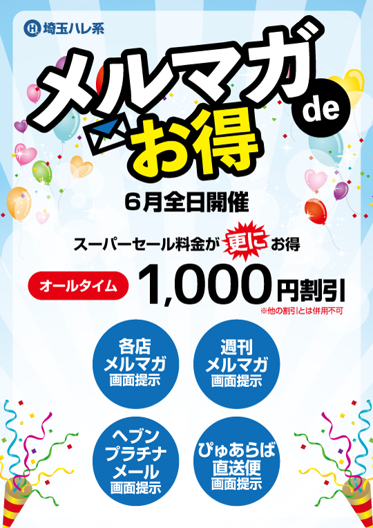 各店メルマガ、週刊メルマガ(グループ総合メルマガ)、ヘブンプラチナメール、ぴゅあらば直送便のいずれかを登録し、配信されたメルマガ画面の提示にて、各店のスーパーセール料金がオールタイム更に1,000円割引になるお得なイベントです。