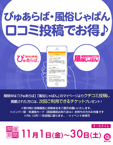 期間中は「ぴゅあらば」「風俗じゃぱん」のマイページよりクチコミ投稿し掲載された方には、次回ご利用できるチケットプレゼント!