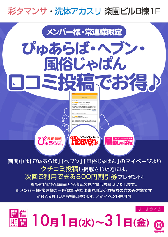 期間中は「ぴゅあらば」「ヘブン」「風俗じゃぱん」のマイページよりクチコミ投稿し掲載された方には、次回ご利用できる500円割引券プレゼント!