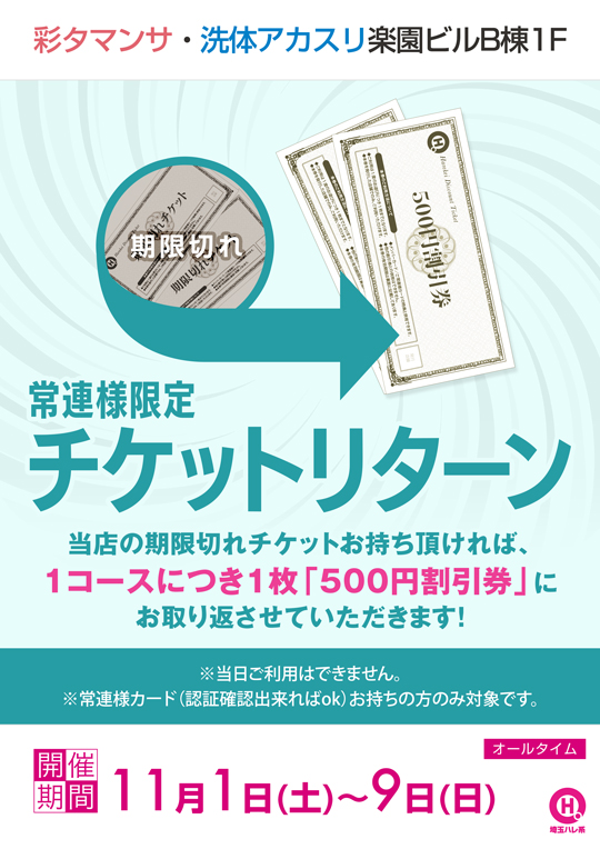 当店の期限切れチケットお持ち頂ければ、1コースにつき1枚「500円割引券」にお取り返させていただきます!