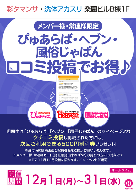 期間中は「ぴゅあらば」「ヘブン」「風俗じゃぱん」のマイページよりクチコミ投稿し掲載された方には、次回ご利用できる500円割引券プレゼント!