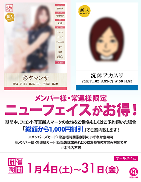 期間中、フロント写真新人マークの女性をご指名もしくはご予約頂いた場合「総額から1,000円割引」でご案内致します!