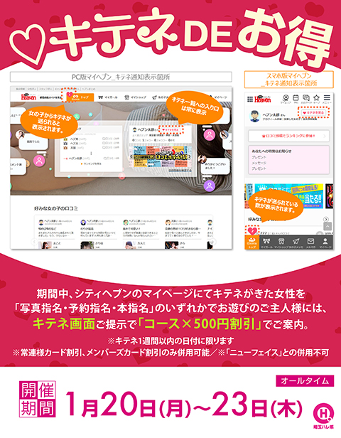 期間中、シティヘブンのマイページにてキテネがきた女性を「写真指名・予約指名・本指名」のいずれかでお遊びのご主人様には、キテネ画面ご提示で「コース×500円割引」でご案内。