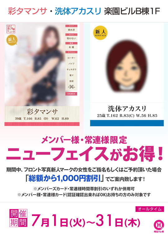 期間中、フロント写真新人マークの女性をご指名もしくはご予約頂いた場合「総額から1,000円割引」でご案内致します!