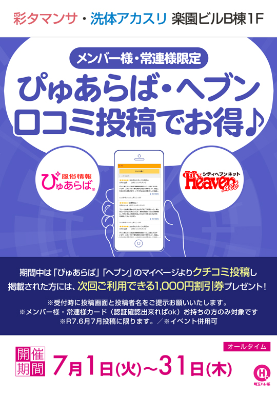 期間中は「ぴゅあらば」「ヘブン」のマイページよりクチコミ投稿し掲載された方には、次回ご利用できる1,000円割引券プレゼント!