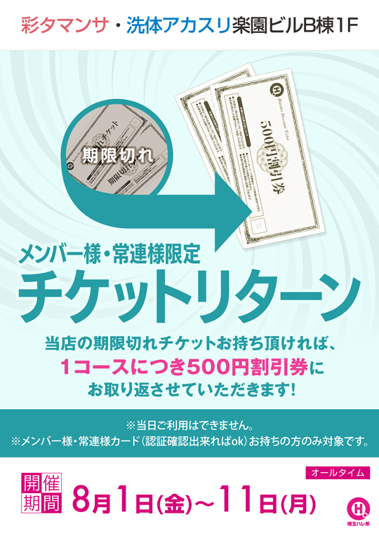 当店の期限切れチケットお持ち頂ければ、1コースにつき500円割引券にお取り返させていただきます!