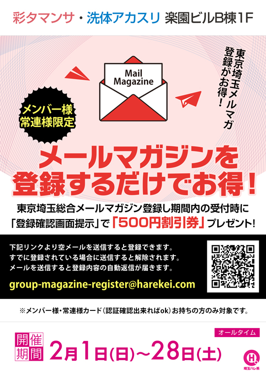 東京埼玉総合メールマガジン登録し期間内の受付時に「登録確認画面提示」で「500円割引券」プレゼント!
