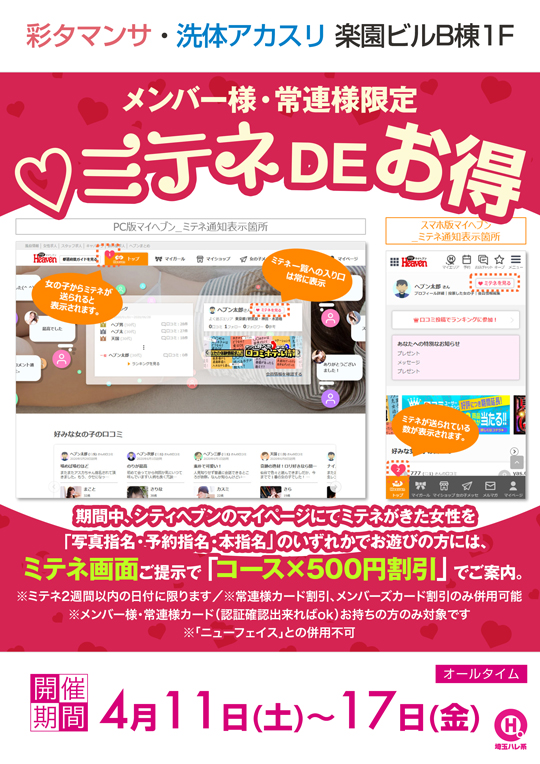 期間中、シティヘブンのマイページにてミテネがきた女性を「写真指名・予約指名・本指名」のいずれかでお遊びの方には、ミテネ画面ご提示で「コース×500円割引」でご案内。